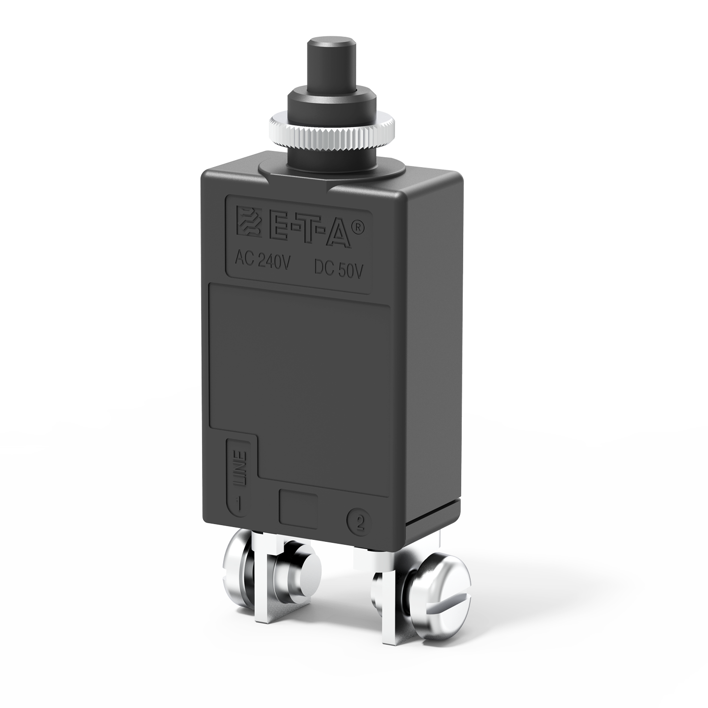 Single pole high performance thermal circuit breaker, with push-to-reset tease free, trip-free snap action mechanism (R-type TO CBE to EN 60934). Designed for threadneck panel mounting and for applications with a high fault current switching requirement.