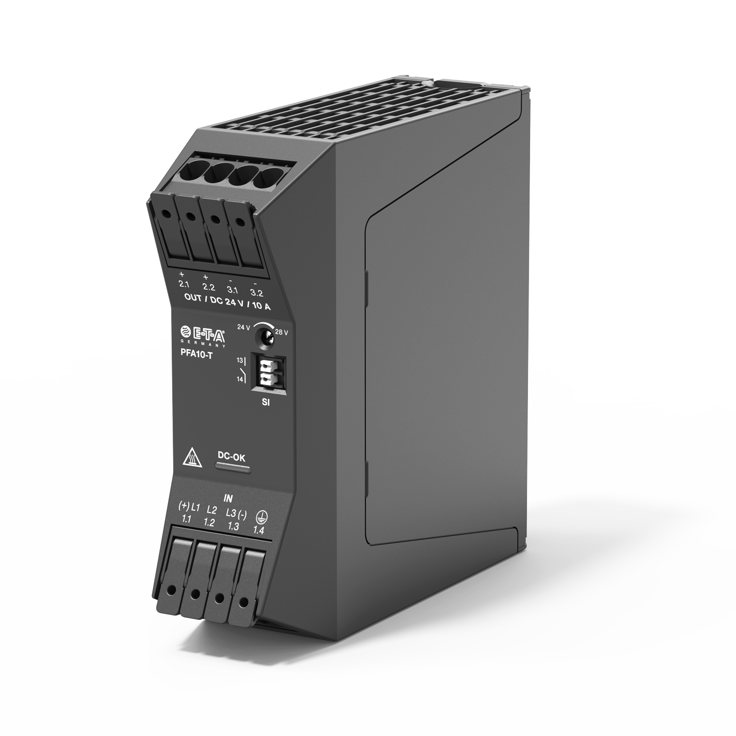 The primary pulsed PFA10-T switch mode power supply unit is ideal for automation and mechanical engineering applications. The compact design allows space-saving integration in control cabinets with limited installation space. The housing with 25° inclined connections enables tool-free installation and quick replacement.